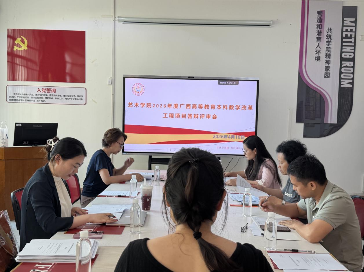 4月10日下午,艺术学院/东盟艺术学院2026年度广西高等教育本科教学改革工程项目答辩评审会,在学院会议室大同楼D118顺利举行。本次会议由艺术学院/东盟艺术学院执行院长赵小梅教授主持,学院学术委员会全体委员担任评审专家,18位申报区级教改课题的教师参与答辩,另有多位教师主动到场旁听学习。