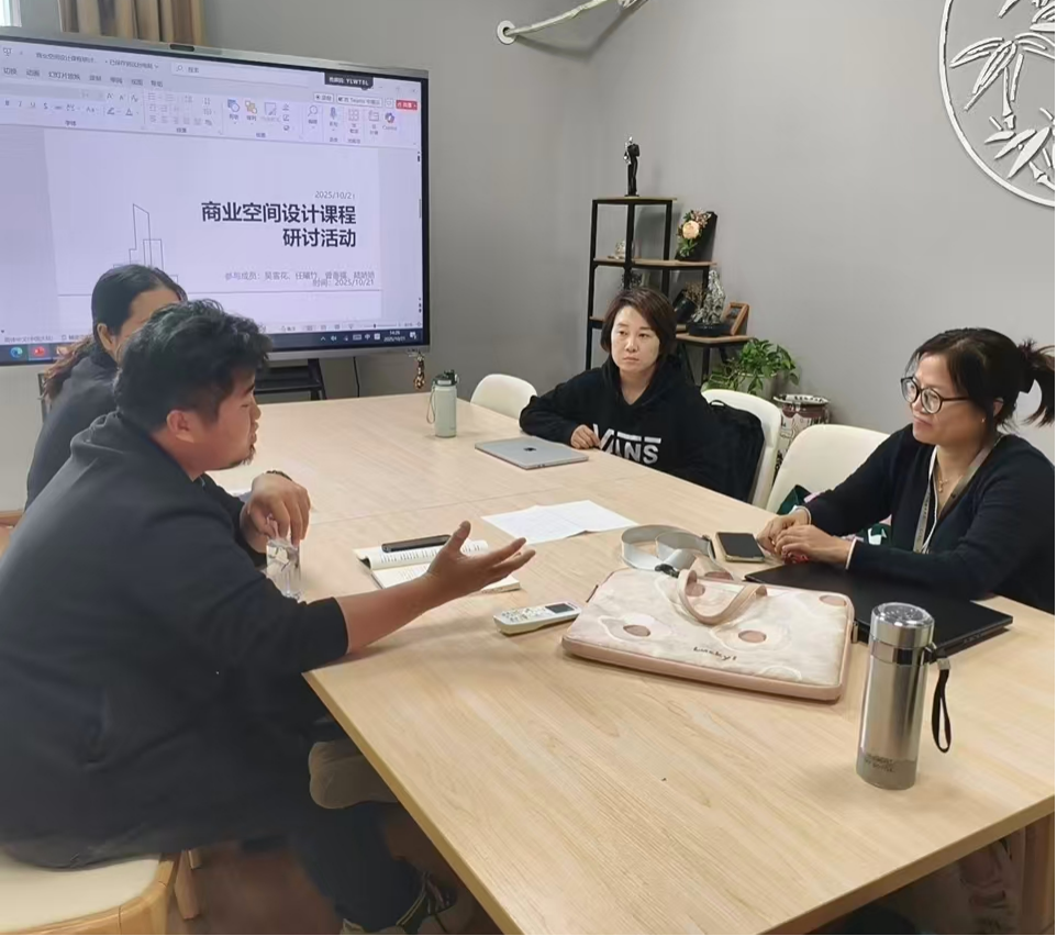 小组成员都从不同角度展开讨论,建议进一步强化项目式教学,通过真实案例增强学生的空间规划与商业思维整合能力,增加校企合作实践模块,强调数字化工具在商业空间设计中的应用价值,以及关于学生个性化学习路径设计的思考。经过充分讨论,小组初步形成课程内容调整与结构优化的方向,包括细化模块化教学单元、强化项目式教学、整合跨学科资源等具体举措。与会教师一致认为,需以学生能力提升为核心,通过持续迭代课程设计,回应行业发展与人才培养的新需求。