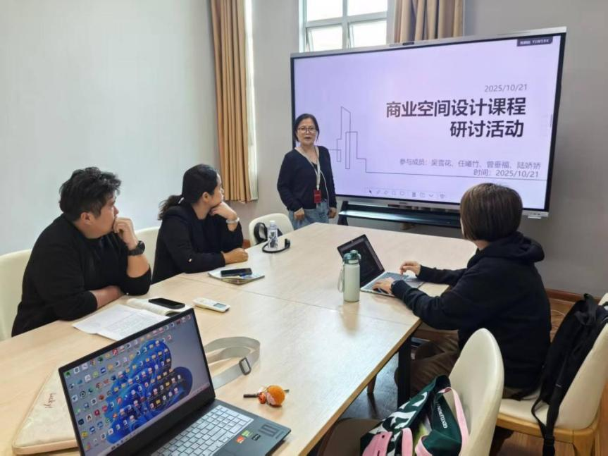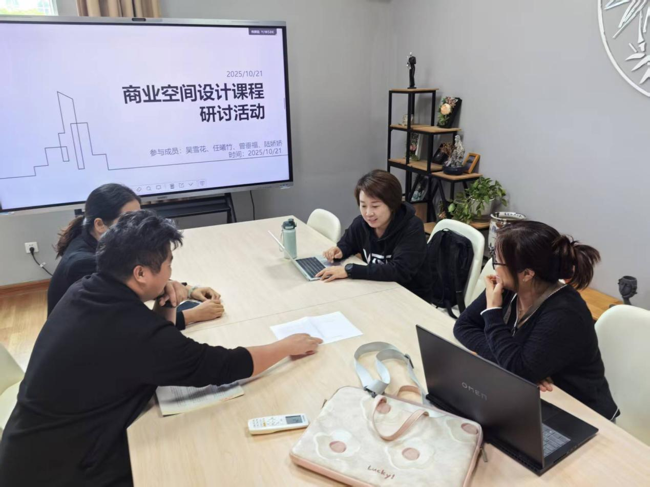 本次活动由吴雪花老师主持,教学小组成员任曦竹老师、曾垂福老师、陆娇娇老师共同参与,围绕当前环境设计专业《商业空间设计》课程教学中的核心挑战展开深入交流,旨在提升教学实效。会议聚焦当前教学中存在的实际问题,如理论教学与实践环节的衔接、学生创新能力的培养、行业需求与课程设置的匹配度等。与会教师结合自身教学经验,分析了课程现有结构的优势与不足,并就如何将行业前沿动态、跨学科知识融入课堂展开了热烈讨论。
