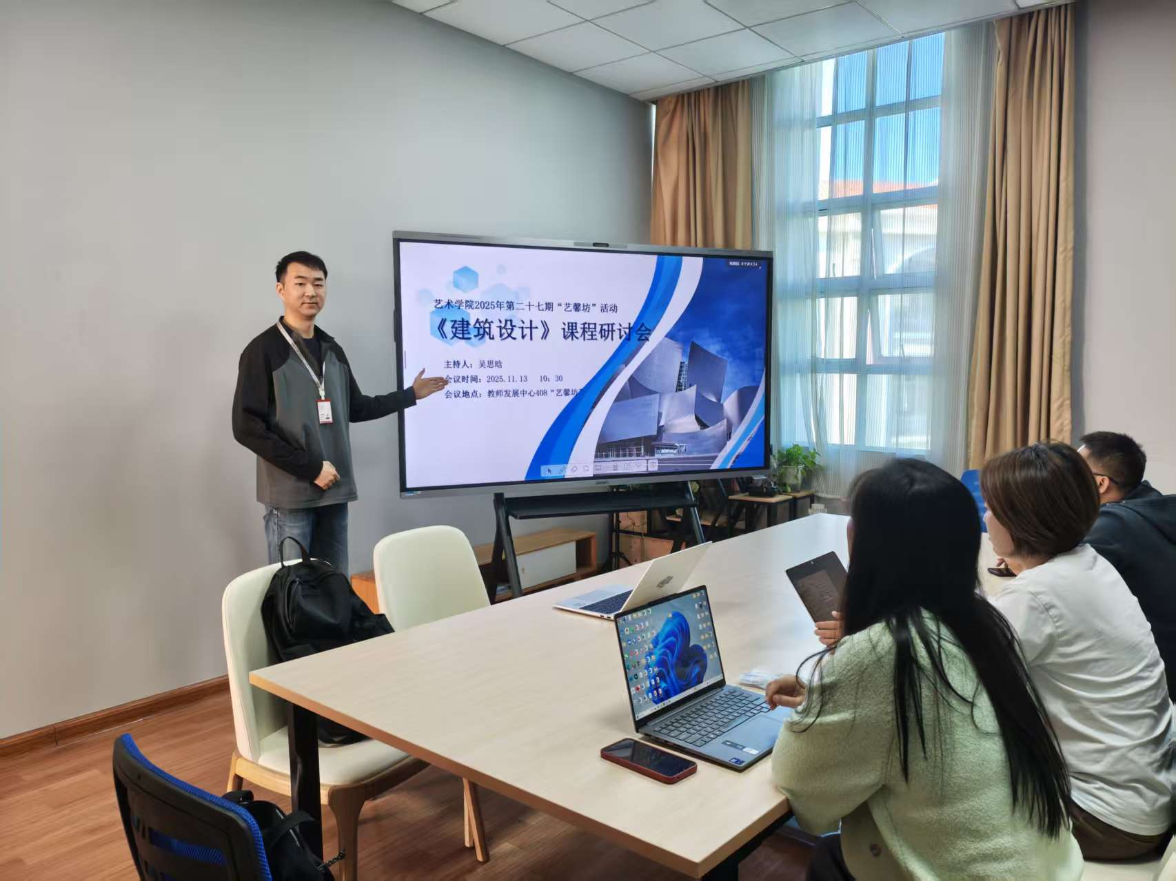 11 月13日,艺术学院在教师发展中心 408 “艺馨坊”活动室 开展第二十七期 “艺馨坊” 活动 ——《建筑设计》课程研讨会,会议由吴思晗老师主持,相关课程教师参与,聚焦课程优化与新学科设计人才培养展开深入研讨。