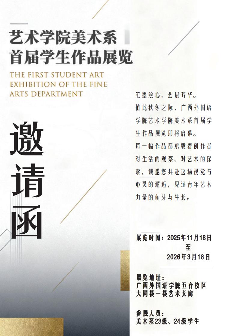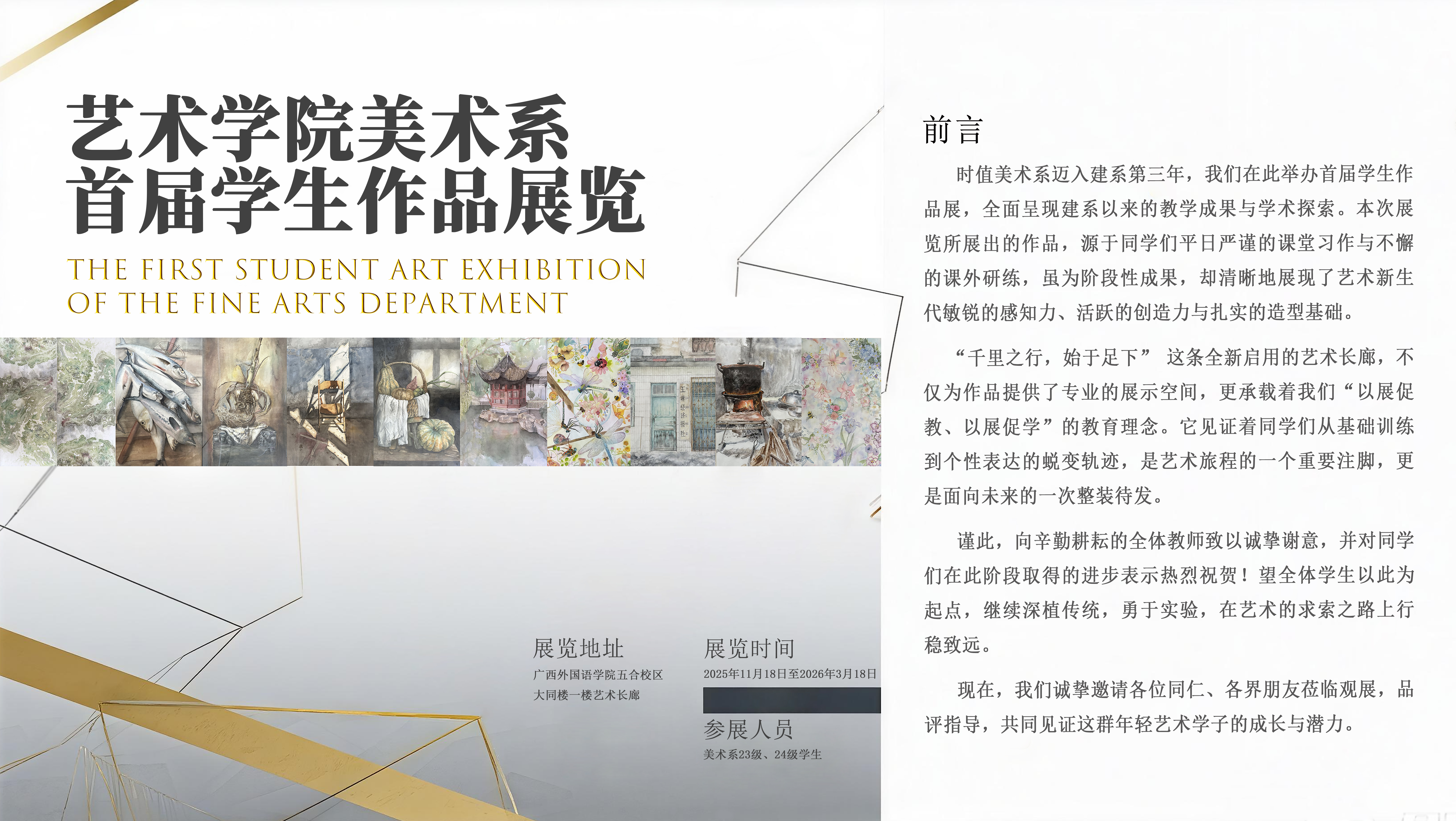时值秋冬之交,广西外国语学院艺术学院美术系首届学生作品展览于2025年11月18日至2026年3月18日在五合校区大同楼一楼艺术长廊正式启幕、开展。本次展览作为美术系建系以来首次大型学生成果展示,将全面呈现23级、24级学生的艺术创作实力,彰显“以展促教、以展促学”的教育理念。