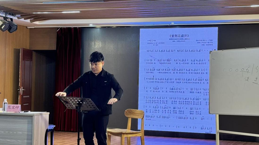 讲解《紫荆花盛开》时,范老师借着手势的收放层次:起势轻抬如花瓣舒展,递进处幅度随节奏放大,收尾时利落收束——既清晰演示了合唱节奏的控制技巧,也把歌曲的深情揉进了动作里,现场瞬时响起了连片的掌声。