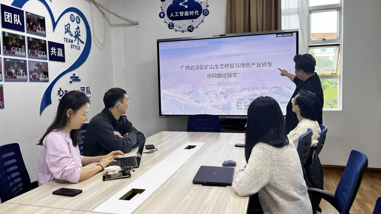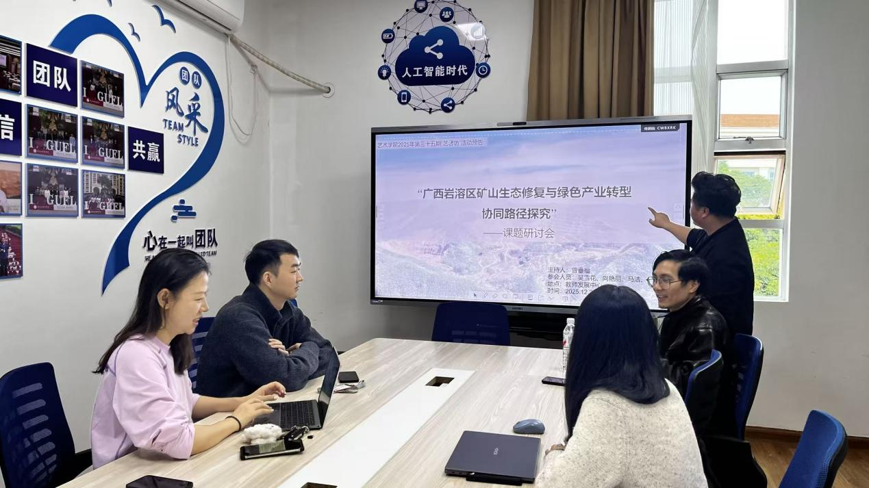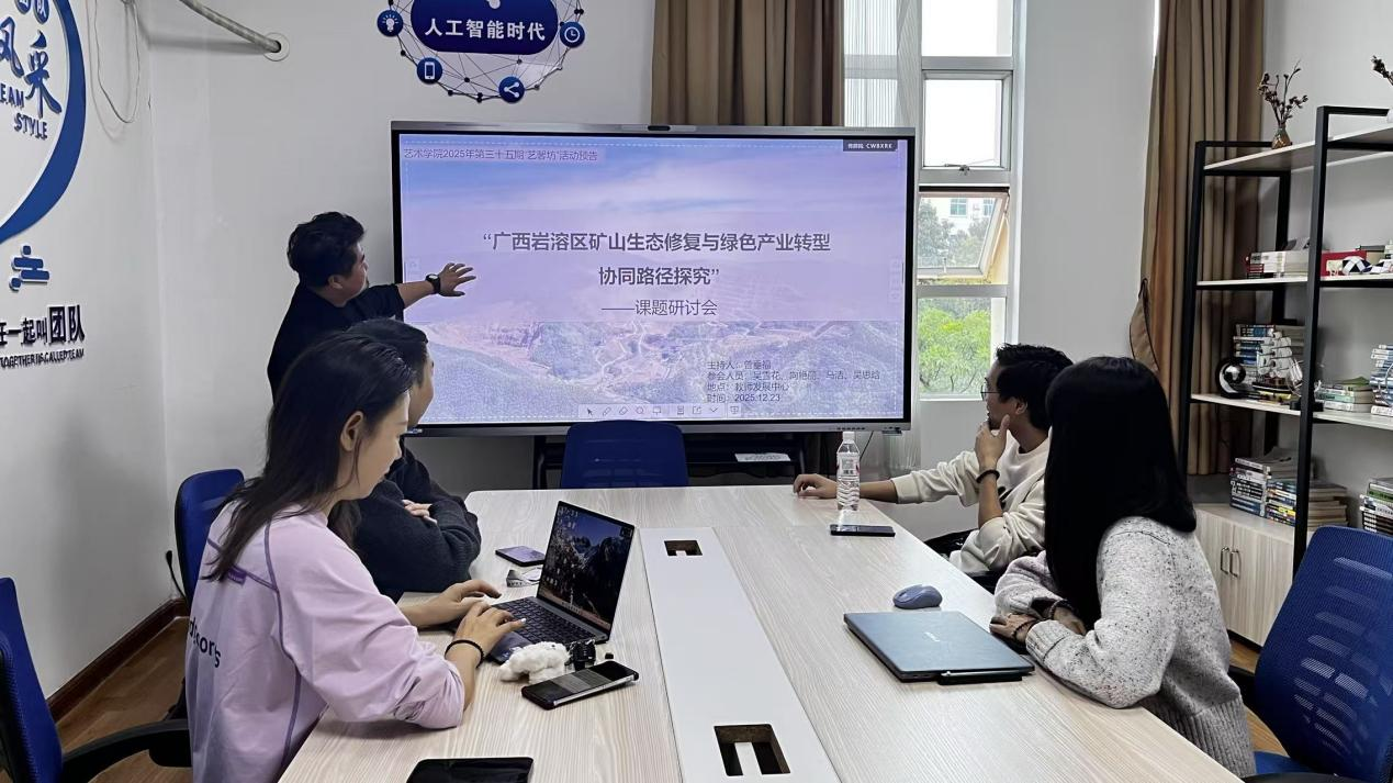 12月23日,广西外国语学院艺术学院第三十五期“艺馨坊”活动——“广西岩溶区矿山生态修复与绿色产业转型协同路径探究”课题研讨会在学校教师发展中心408顺利举行。此次研讨会由课题主持人曾垂福老师主持,课题参与人陆娇娇、吴雪花、向艳丽、马洁、吴思晗共同参与,深入探讨广西岩溶区矿山生态修复与绿色产业转型的协同发展路径。