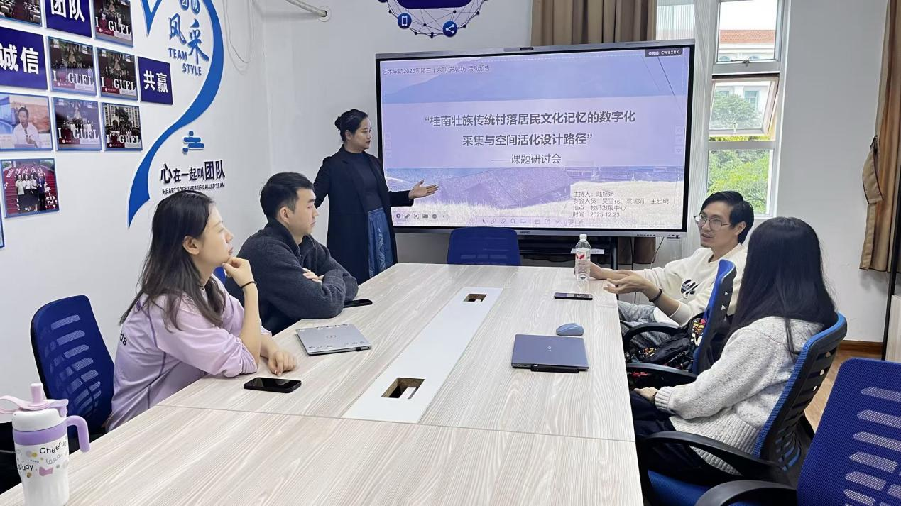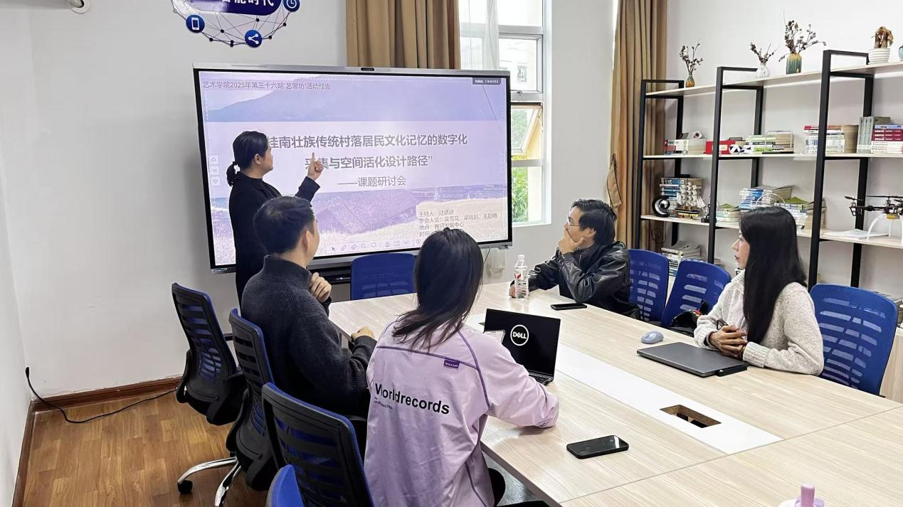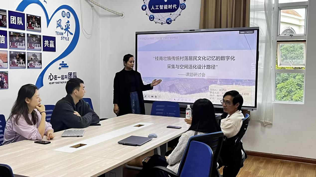为积极响应国家文化数字化战略,深化对本土民族文化遗产的保护与活化研究,进一步提升学院科研氛围与学术交流水平,2025年12月23日,广西外国语学院艺术学院在教师发展中心408室成功举办了第36期“艺馨坊”学术活动。本次活动聚焦“桂南壮族传统村落居民文化记忆的数字化采集与空间活化设计路径”课题研讨会,由课题主持人陆娇娇老师担任主持,课题组核心成员曾垂福、吴雪花、梁瑞娟、王起明等老师共同参与,展开了一场富有深度与前瞻性的学术探讨。