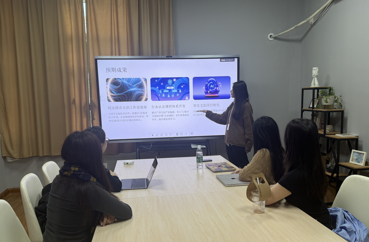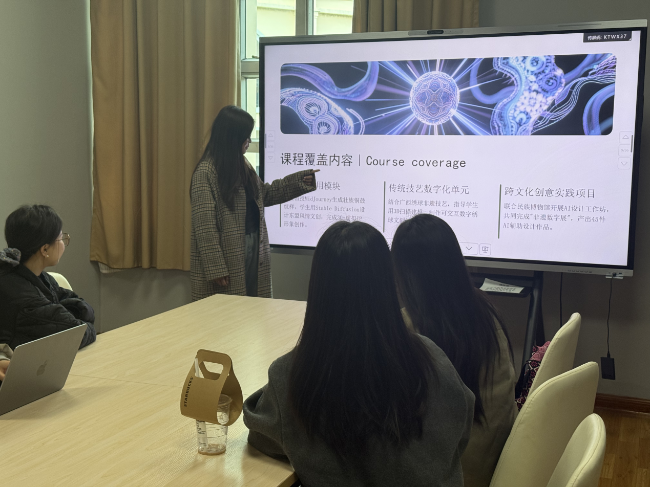 为积极响应人工智能时代对设计人才培养的新要求,深入推进课程改革与产学研融合,3月11日,艺术学院/东盟艺术学院艺术设计系在教师发展中心408“艺馨坊”开展《AI+文创设计》课程研讨,共绘非遗数字化创新蓝图。会议聚焦“AI赋能本土非遗文创”,旨在明确新课程建设方向,规划协同育人新路径。