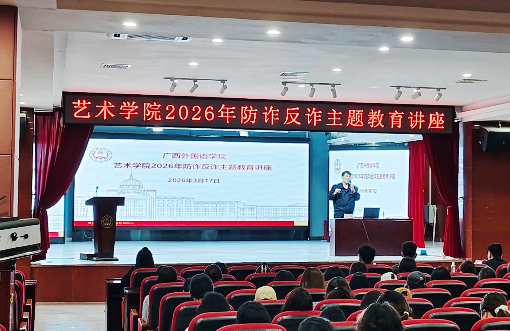 随着互联网的技术快速发展,电信网络诈骗的手段不断的更新迭代,大学校园已经成为诈骗案件的高发地区之一。为了实现筑牢校园安全防线,增强学生反诈意识,3月17日下午,艺术学院在学校礼堂开展开学第一课暨“防诈反诈”主题教育讲座,特邀五合派出所的刘曌警官给予我校师生授课。出席本次活动领导、嘉宾有五合派出所副所长韦启云,广西外国语学院学生工作处副处长陈伟鸿,广西外国语学院安稳办主任马殿飞,五合派出所警官刘曌、奚永忠,广西外国语学院艺术学院全体辅导员及各班级学生代表参加本次讲座。