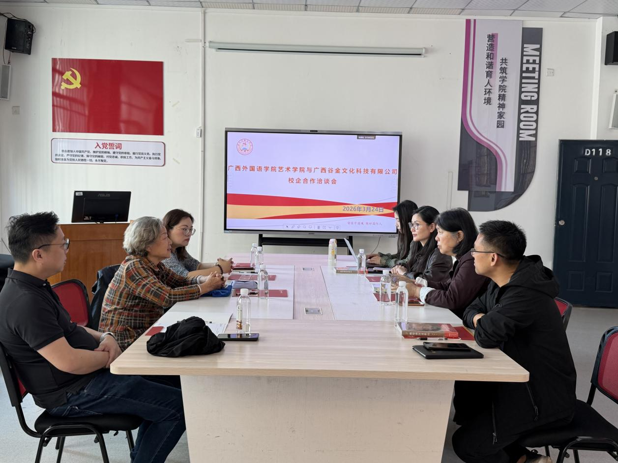 为抢抓人工智能时代机遇,推动AIGC技术与艺术设计教育深度融合,培养适应数字经济发展的应用型人才,2026年3月24日下午,广西外国语学院艺术学院/东盟艺术学院与广西谷金文化科技有限公司校企合作洽谈会顺利举行。