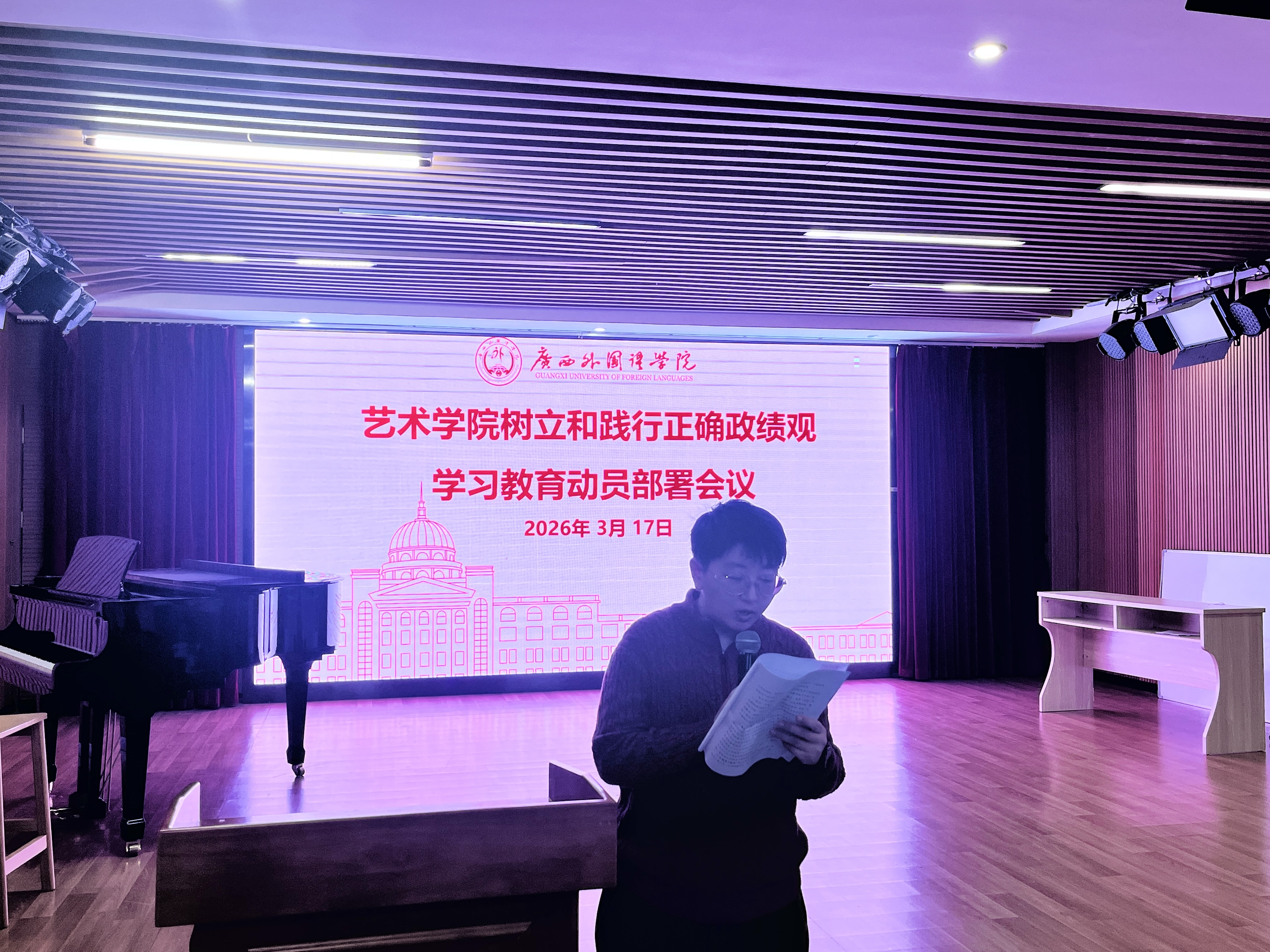会议强调,要准确把握学习教育目标任务,全面落实“立党为公、为民造福、科学决策、真抓实干”的总要求。要紧扣艺术学科专业特点,深刻理解“政绩为谁而树、树什么样的政绩、靠什么树政绩”等重大问题,将学习教育与学院教学科研、人才培养、艺术创作、社会服务等中心工作紧密结合,以经得起检验的育人实绩和艺术成果践行初心使命。